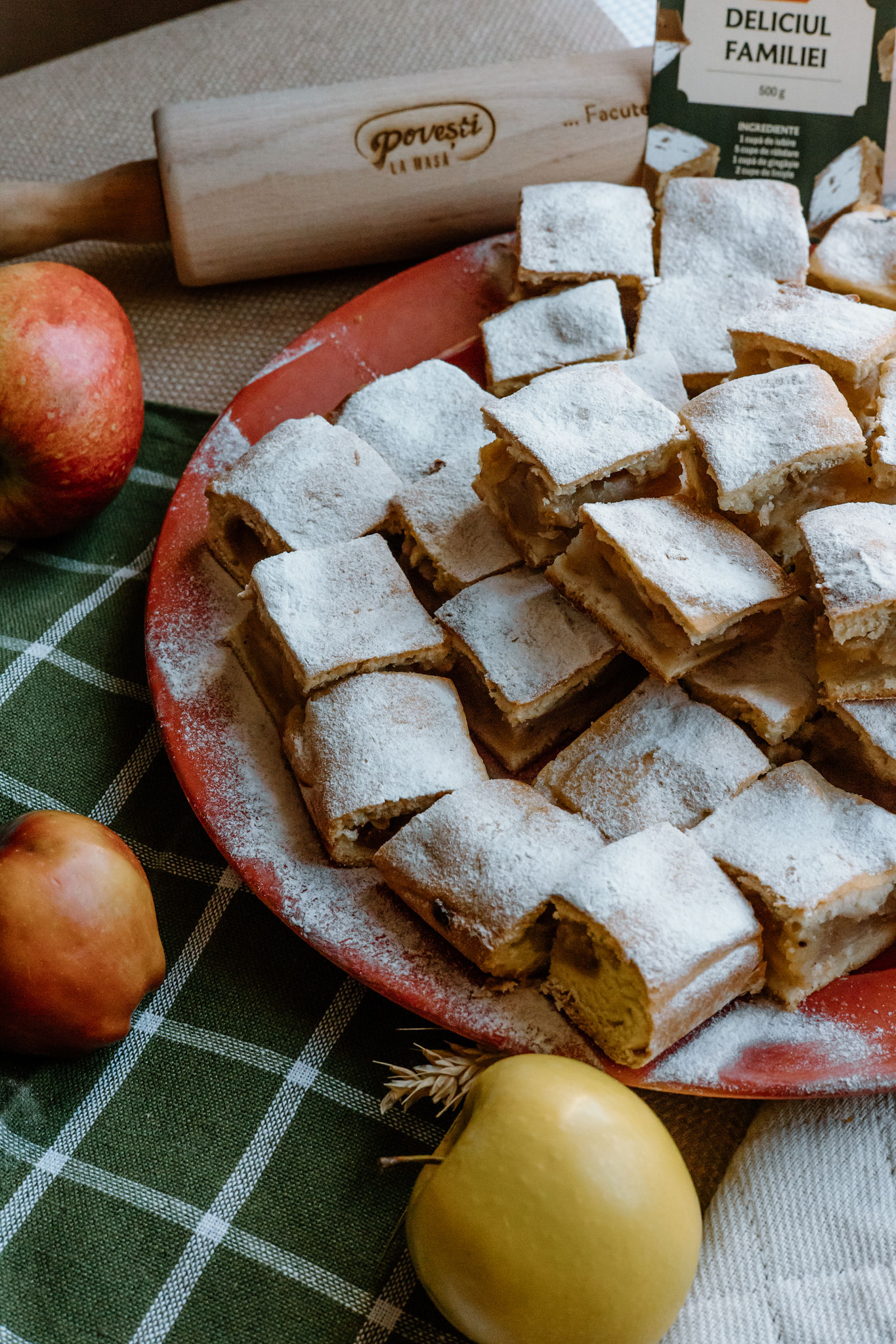 Ingrediente: făină integrală de grâu, unt, zahăr pudră, zahăr vanilat, ouă, smântână, mere, scorțișoară